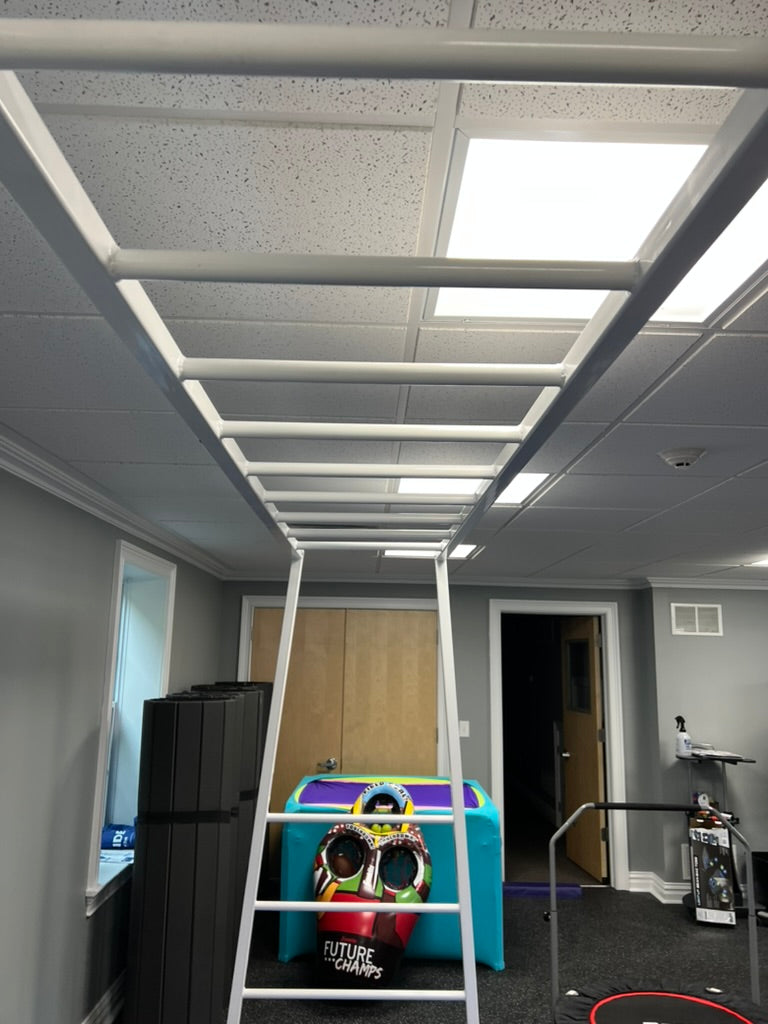 Our monkey bars and climbing structures are hand-crafted with premium steel and a customizable design. They can be a stand-alone structure or built into other units or walls. Monkey bars are perfect for promoting motor planning, bilateral coordination, upper body strength, hand-eye coordination, and postural control while providing proprioceptive and vestibular input.