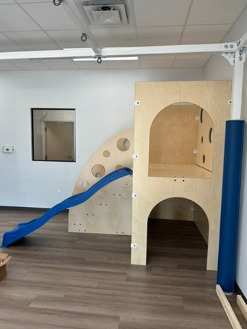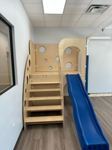 Features a second-level platform with an enclosed cave area, scooterboard ramp, slide, steps, and built-in storage — or opt for additional cave space.